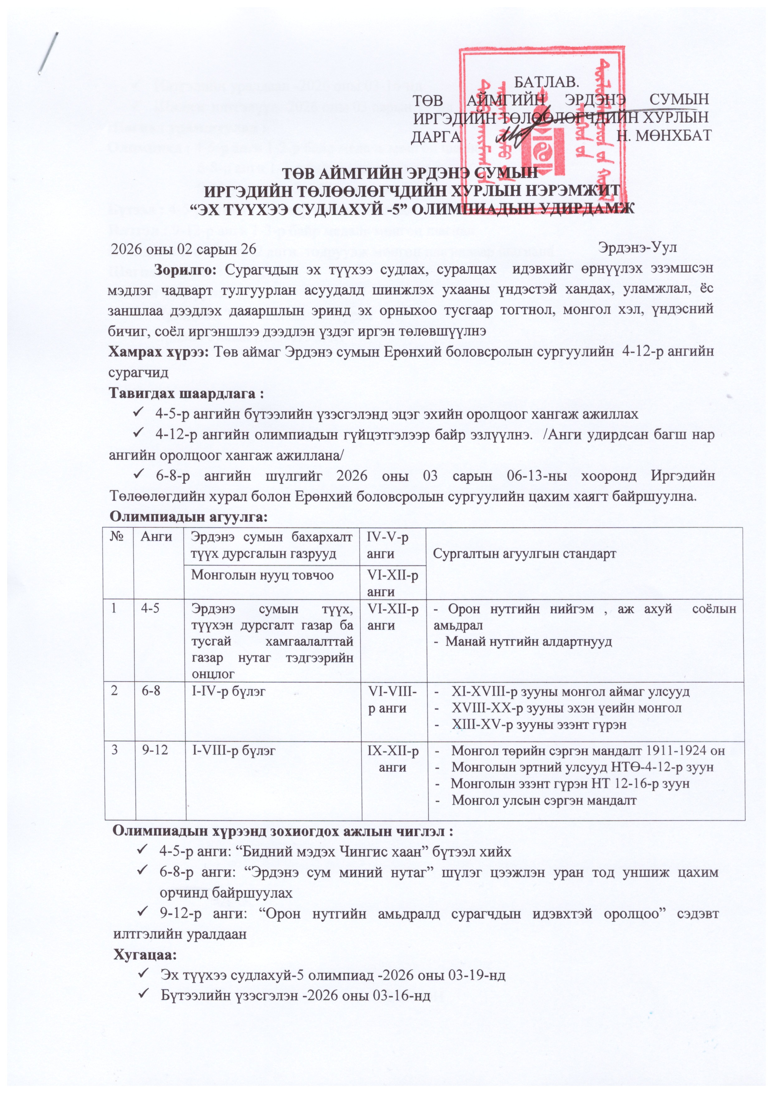 Сумынхаа нийгмийн хөгжлийн бүх хүрээг хамарсан, эрх зүйн үндэслэлтэй нутгийн иргэдийн язгуур эрх ашгийг хангасан бодлого, шийдвэр, дүрэм журмыг боловсруулан баталж, хэрэгжилтийг хангуулан орон нутгийн тогтвортой хамт олныг төлөвшүүлэх замаар сумаа улсын тэргүүний сумын хэмжээнд хүргэж хөгжүүлэхийг эрмэлзэнэ. Сумынхаа нийгмийн хөгжлийн бүх хүрээг хамарсан, эрх зүйн үндэслэлтэй нутгийн иргэдийн язгуур эрх ашгийг хангасан бодлого, шийдвэр, дүрэм журмыг боловсруулан баталж, хэрэгжилтийг хангуулан орон нутгийн тогтвортой хамт олныг төлөвшүүлэх замаар сумаа улсын тэргүүний сумын хэмжээнд хүргэж хөгжүүлэхийг эрмэлзэнэ.2026-02-27